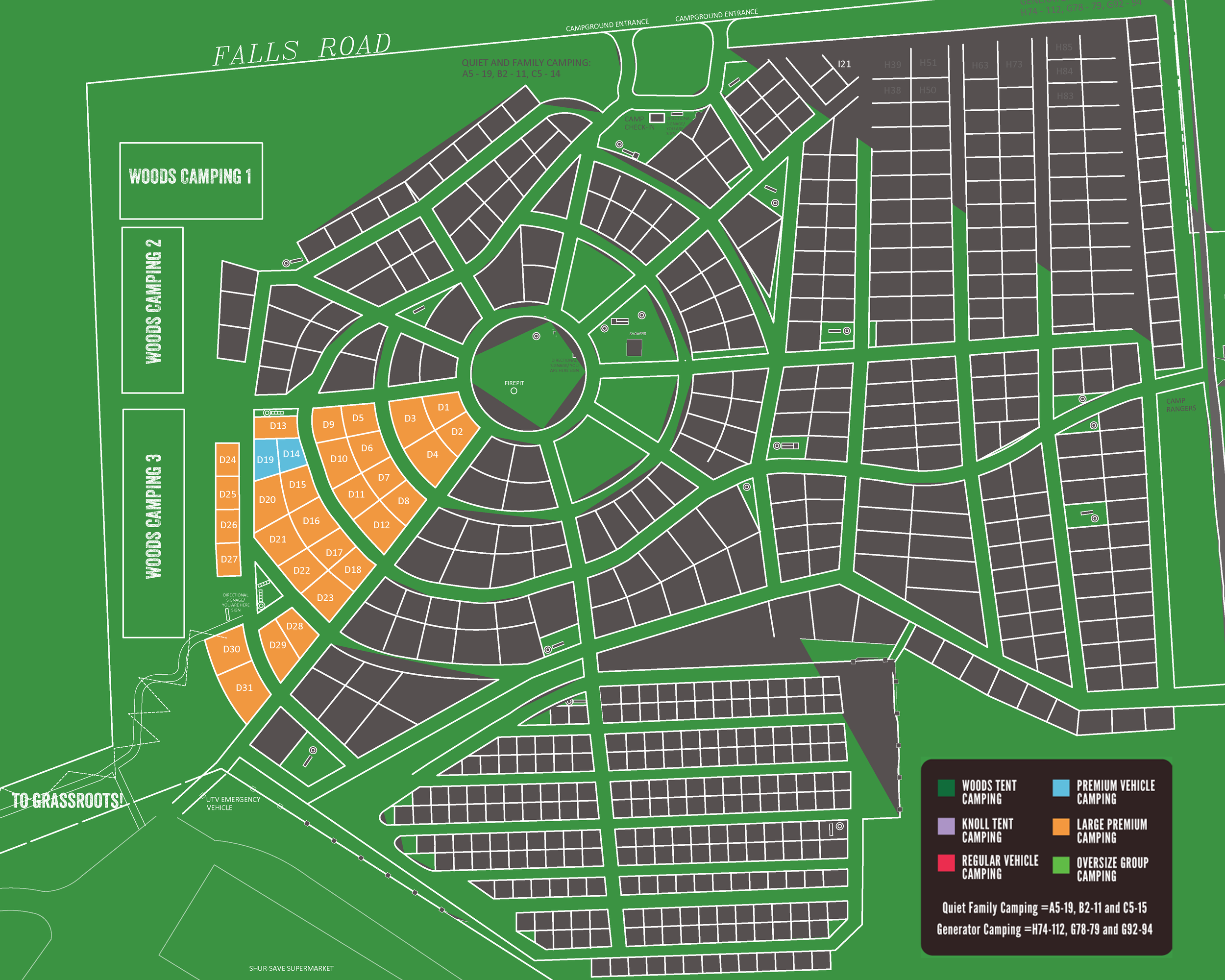 There is a mix of Regular Vehicle, Premium Vehicle, Large Premium Vehicle, and Oversized Group Camping sites at Across the Way. Only Premium Vehicle and Large Vehicle Campsites in Section D will be available for GrassRoots Culture Camp.
