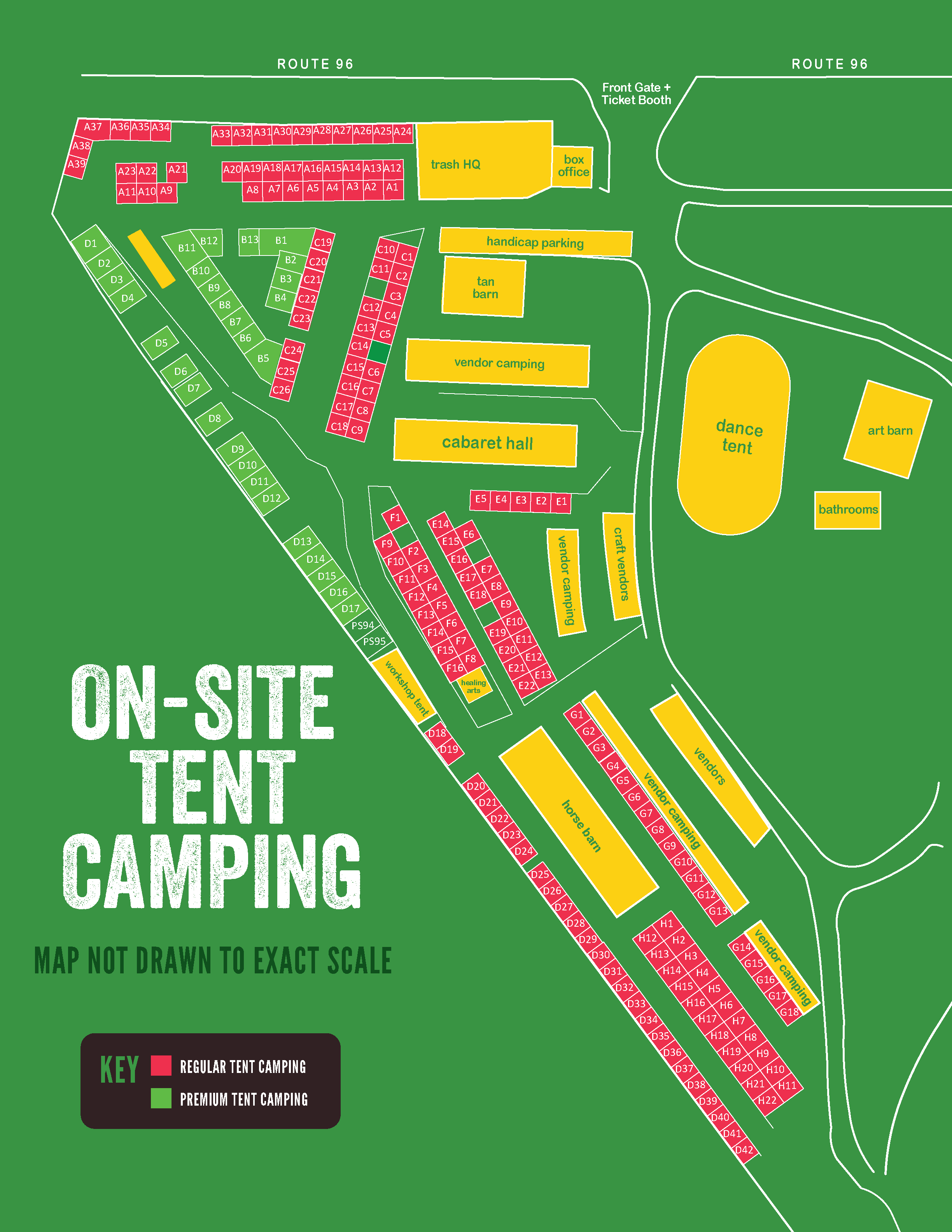 Premium Tent Campsites are larger than our Regular Tent Campsite size of 15’x15, and can accommodate slightly larger tents. Attendees with large tents that do not allow for the 5’ separation distance between structures according to the regulations described below will be moved to an overflow campsite at our Across the Way Campground.